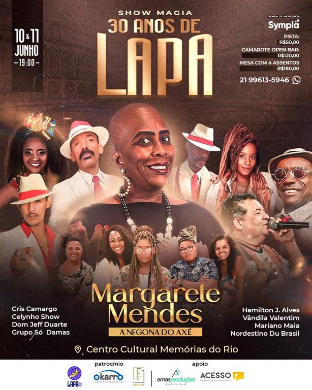 Nos dias 10 e 11 de junho, às 19h, a cantora Margarete Mendes comemora seus 30 anos de carreira com o Show Magia 30 anos de Lapa, com sua banda, Mojubá, que significa “saudações aos orixás” em ioruba. A proposta do show é contar a história de 30 anos de carreira da Rainha da Lapa, em três blocos. A cada bloco será totalmente característico e embalado por muita magia musical. Participações especiais: Cris Camargo, Celynho Show, Dom Jeff Duarte, Grupo Só Damas, Hamilton J. Alves, Vândila Valentim, Mariano Maia e Nordestino Du Brasil. O Centro Cultural Memórias do Rio fica na Avenida Gomes Freire 289, Centro – Rio de Janeiro.